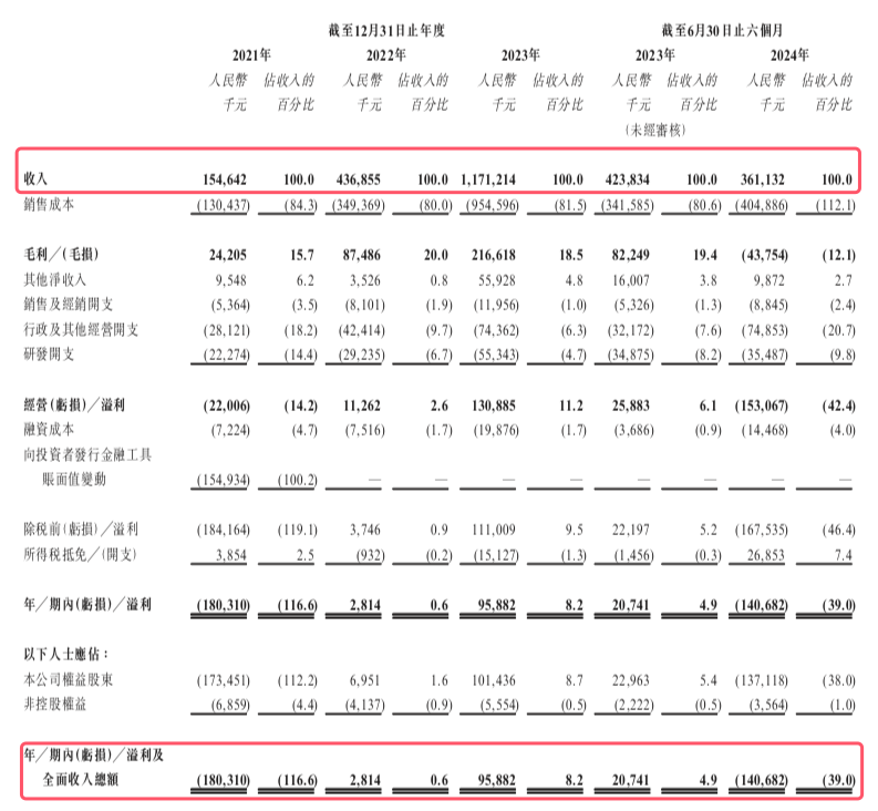 据招股书,2021年至2023年,天域半导体收入分别为1.55亿元、4.37亿元、11.71亿元,净利润分别为-1.8亿元、281.4万元、9588.2万元。2022年扭亏为盈,但2024年上半年再度陷入亏损,实现营收3.61亿元,亏损1.41亿元。
