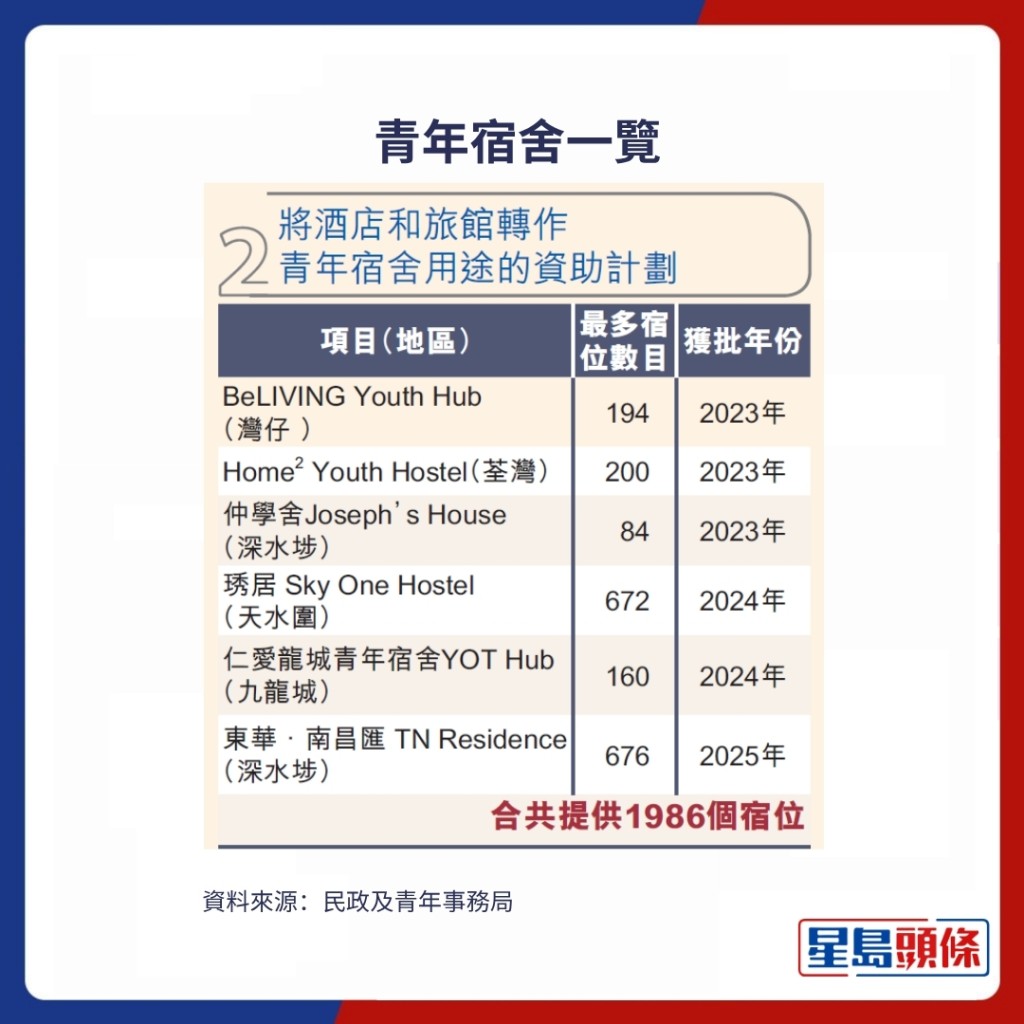 ▲民青局推动“将酒店和旅馆转作青年宿舍用途的资助计划”,共有6个项目获批。