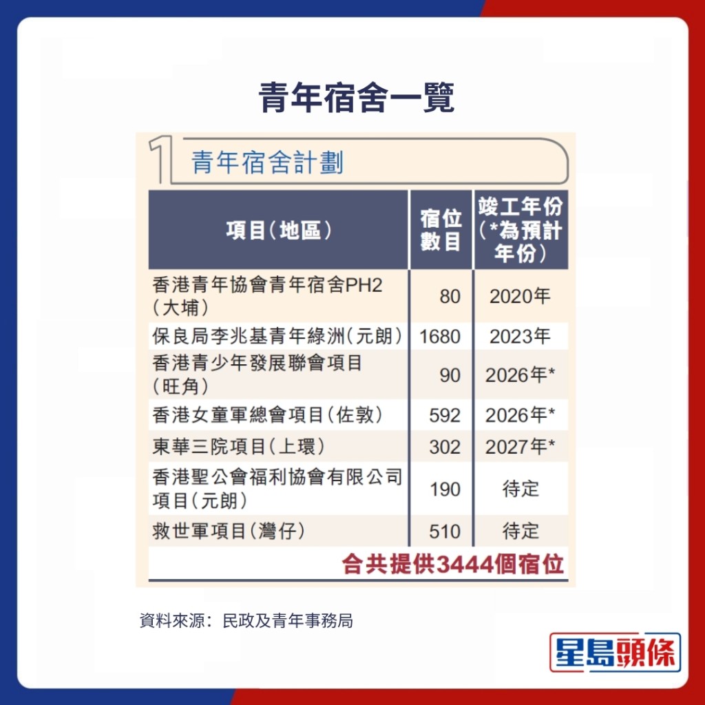 现时共有7个由政府全资兴建的“青年宿舍”项目,加上“将酒店和旅馆转作青年宿舍用途的资助计划”共有6个项目获批,预计为有需要青年提供5430个宿位(见表)。前者有3个项目竣工日期延后,有2个项目标明“待定”。民政及青年事务局指,各项目的规模、楼宇设计和技术要求不尽相同,涉及的规划和土地程序等挑战有异,因应非政府机构在规划、设计、施工及营运上或遇上困难,局方已设立专责小组,提供针对性的支援。