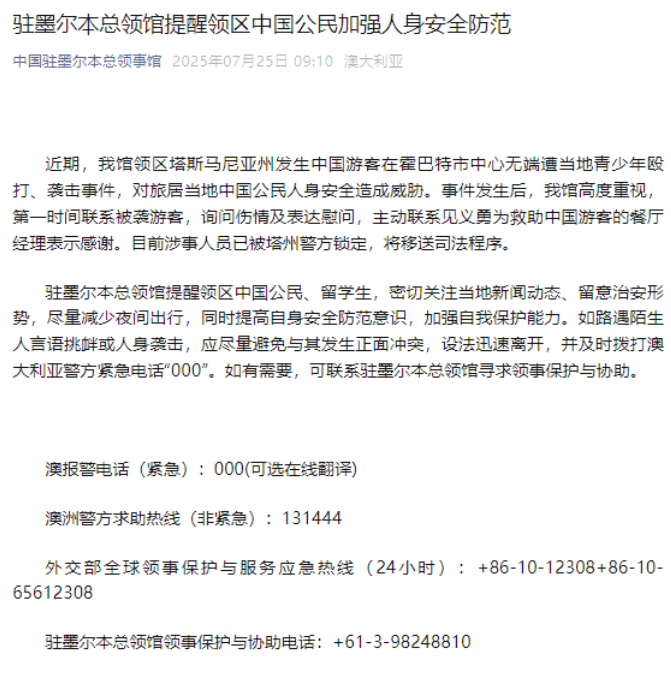 总领馆提醒领区中国公民和留学生,密切关注当地新闻动态、留意治安形势,尽量减少夜间出行,同时提高自身安全防范意识,加强自我保护能力。如路遇陌生人言语挑衅或人身袭击,应尽量避免与其发生正面冲突,设法迅速离开,并及时拨打澳洲警方紧急电话。