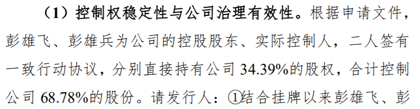 根据申请文件,彭雄飞、彭雄兵为公司的控股股东、实际控制人,二人签有一致行动协议,分别直接持有公司34.39%的股权,合计控制公司68.78%的股份。彭雄飞、彭雄兵为兄弟。