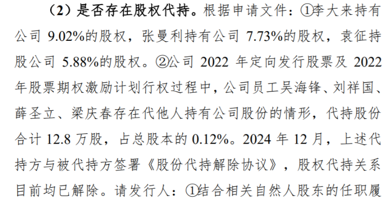 关于是否存在股权代持。根据申请文件,李大来持有公司9.02%的股权,张曼利持有公司7.73%的股权,袁征持股公司5.88%的股权。