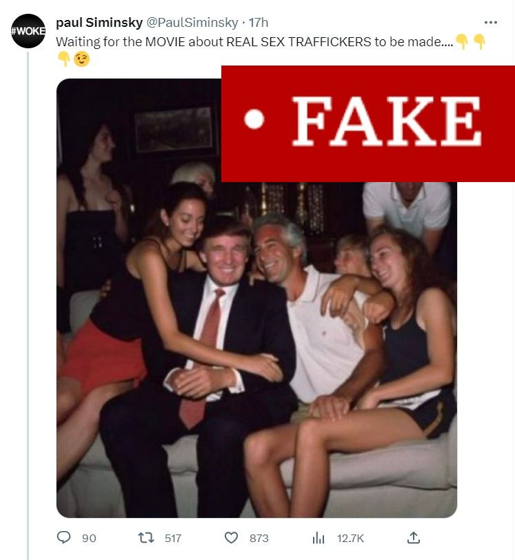 至少2张假照片似显示2人与未成年少女坐在沙发上。另一张照片据称显示特朗普与一名少女在爱泼斯坦的私人岛屿上跳舞,附有说明写道“拍这张照片时,特朗普已经50多岁,什么样的男人会做出这种事?”
