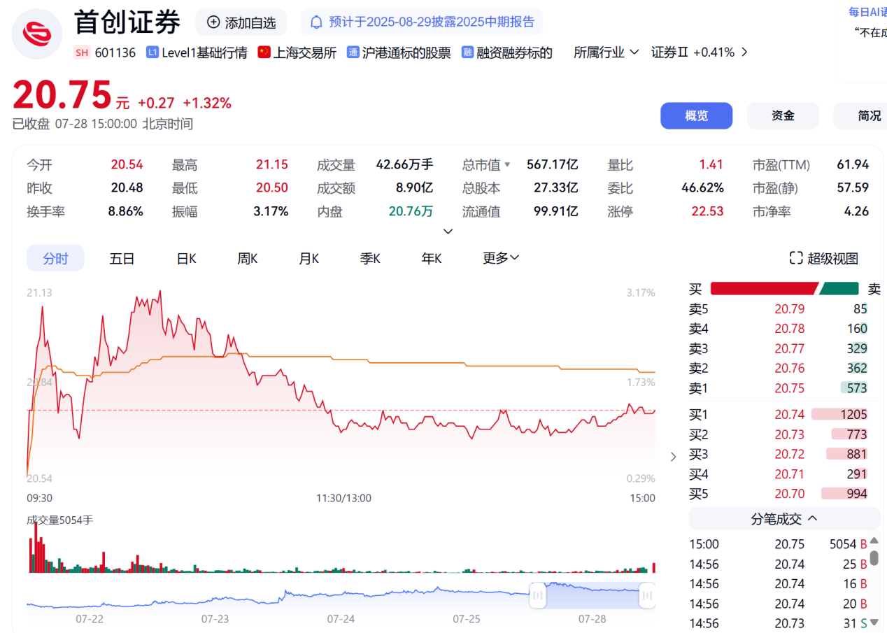 7月28日,首创证券涨1.32%,收报20.75元,盘中触及7月以来最高价21.15元,较6月30日收盘价19.88元涨6.39%。