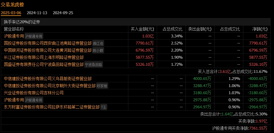 今年以来首创证券仅1次登上龙虎榜, 3月6日龙虎榜净买入1.97亿元;买入总计3.61亿元,占总成交额比11.67%;卖出总计1.64亿元,占总成交额比5.30%。
