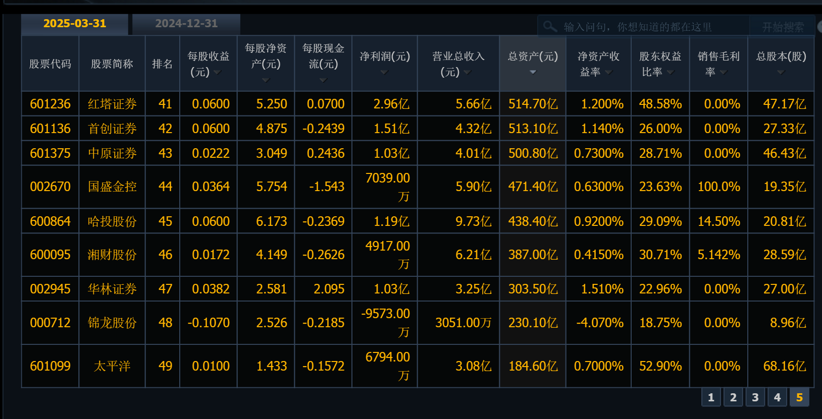 首创证券在行业中处于下游位置,资本实力与头部差距悬殊。2025年第一季度数据显示,在披露财报的49家券商中,首创证券以总资产513.1亿元排第42名,不足龙头中信证券(1.79万亿元)的3%;净利润1.51亿元排名第37名,仅为榜首国泰海通(122.4亿元)的1.2%;以4.32亿元营收排第45名,相当于中信证券同期营收(177.6亿元)的2.4%。