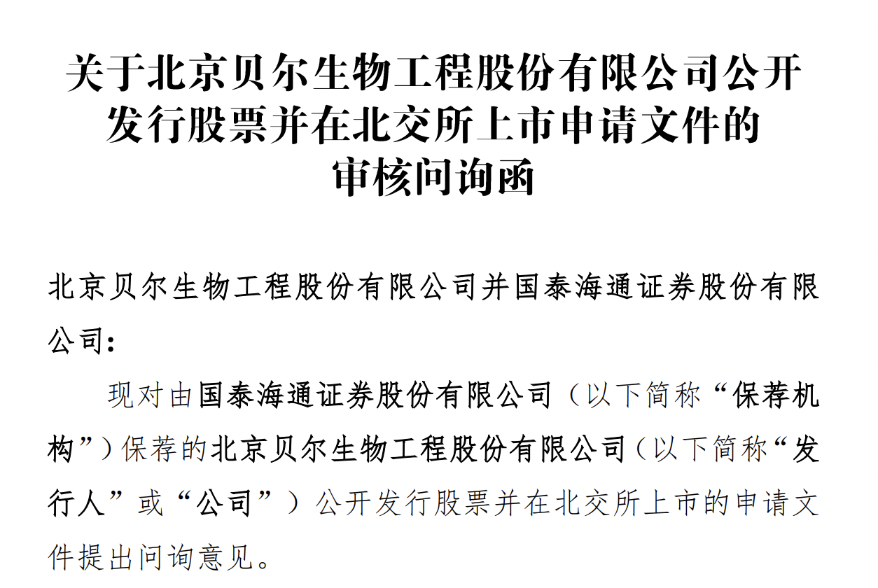 7月25日,北京贝尔生物工程股份有限公司(以下简称:贝尔生物)披露北交所上市审核问询函,保荐机构为国泰海通,保荐代表人为徐亦潇、周成材,会计师事务所为北京德皓国际会计师事务所。