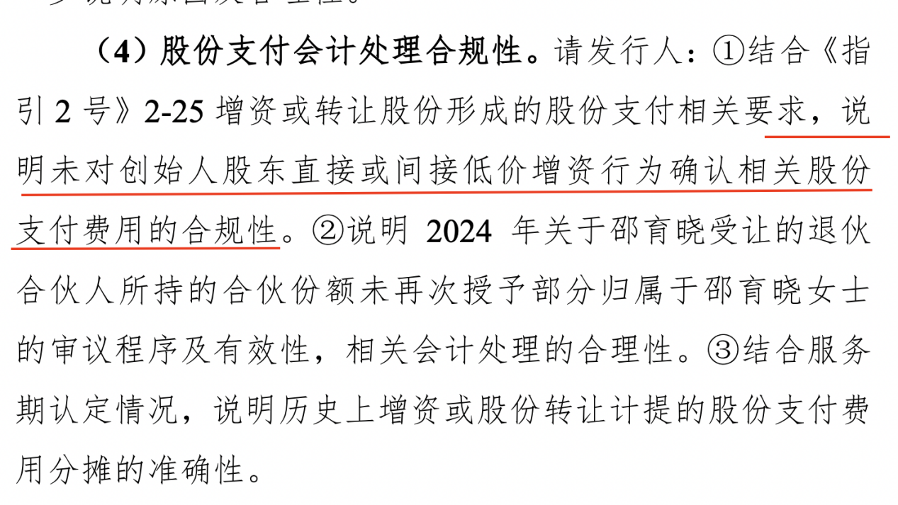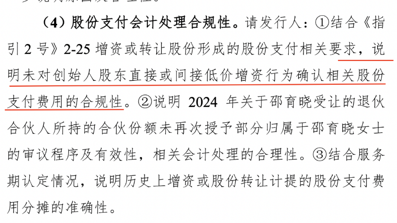 关于股份支付会计处理合规性方面,北交所要求贝尔生物:结合《指引2号》2-25增资或转让股份形成的股份支付相关要求,说明未对创始人股东直接或间接低价增资行为确认相关股份支付费用的合规性。说明2024年关于邵育晓受让的退伙合伙人所持的合伙份额未再次授予部分归属于邵育晓的审议程序及有效性,相关会计处理的合理性。结合服务期认定情况,说明历史上增资或股份转让计提的股份支付费用分摊的准确性。