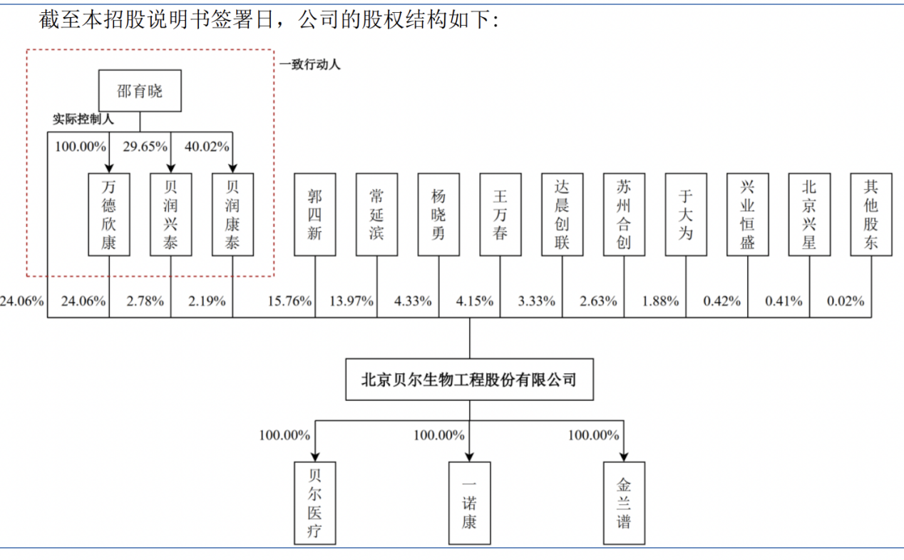 IPO前,邵育晓直接持有公司1804.48万股股份,占公司总股本的24.06%;同时,邵育晓通过其100.00%持股的万德欣康间接持有公司1804.48万股股份,占公司总股本的24.06%;邵育晓分别持有贝润兴泰29.65%、贝润康泰40.02%的出资额,通过贝润兴泰及贝润康泰间接持有公司127.751万股股份,占其总股本的1.70%。