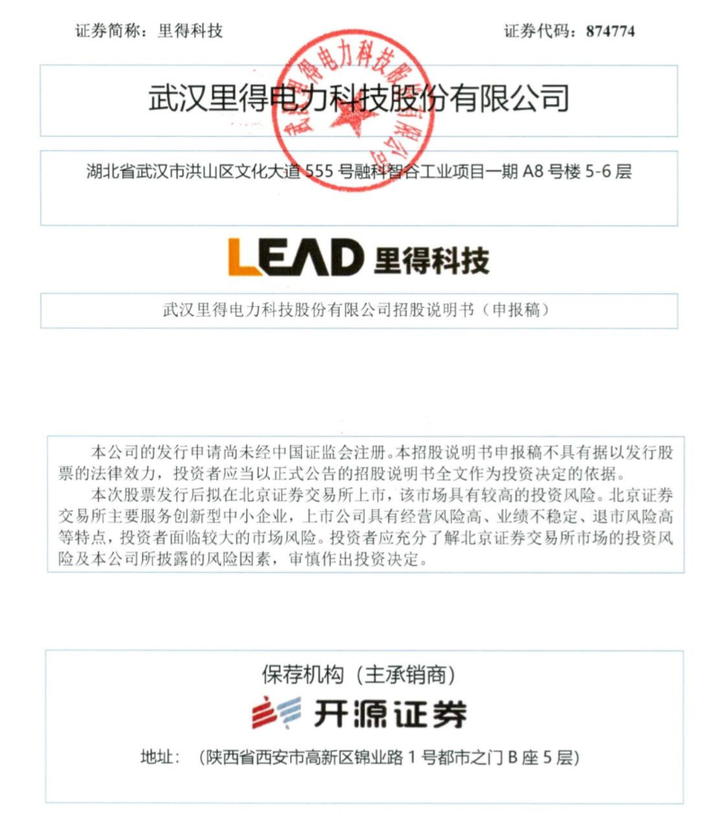 近日,武汉里得电力科技股份有限公司(以下简称“里得科技”) 北交所IPO申请获受理,保荐机构为开源证券股份有限公司,保荐代表人为利佳、张清华,会计师事务所为中审众环会计师事务所(特殊普通合伙)。