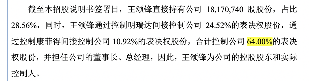本次IPO前,王颂锋直接持有公司18,170,740股股份,占比28.56%,同时,王颂锋通过控制明瑞达间接控制公司24.52%的表决权股份,通过控制康菲得间接控制公司10.92%的表决权股份,合计控制公司64.00%的表决权股份,并担任公司的董事长、总经理,因此,王颂锋为公司的控股股东和实际控制人。