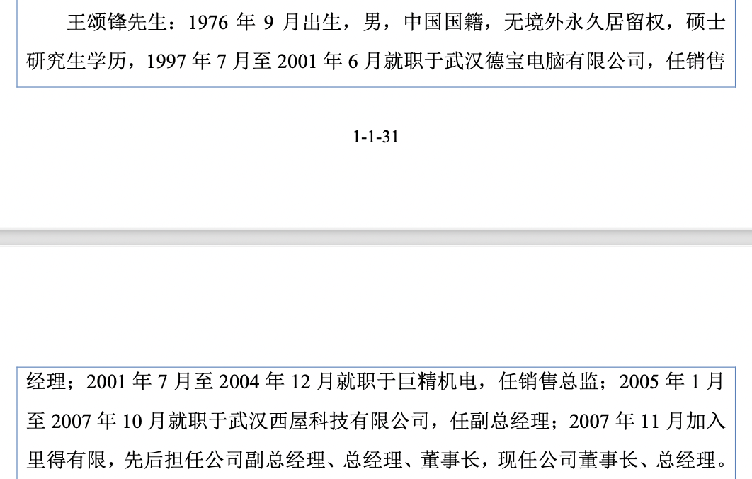 资料显示,王颂锋,1976年9月出生,男,中国国籍,无境外永久居留权,硕士研究生学历,1997年7月至2001年6月就职于武汉德宝电脑有限公司,任销售经理;2001年7月至2004年12月就职于巨精机电,任销售总监;2005年1月至2007年10月就职于武汉西屋科技有限公司,任副总经理;2007年11月加入里得有限,先后担任公司副总经理、总经理、董事长,现任公司董事长、总经理。