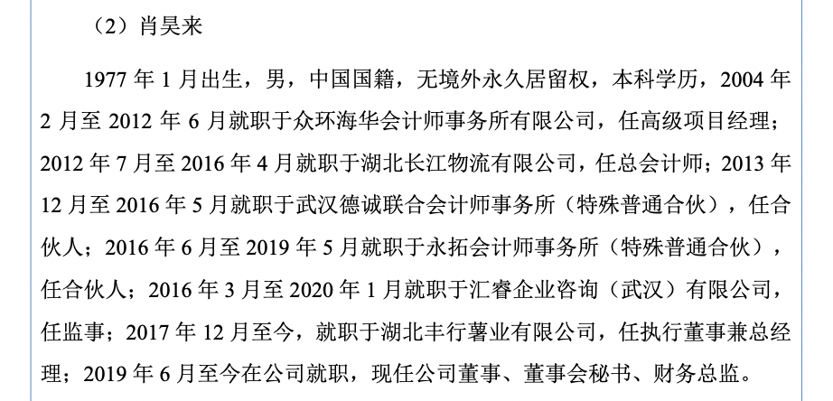 肖昊来,1977年1月出生,男,中国国籍,无境外永久居留权,本科学历,2004年2月至2012年6月就职于众环海华会计师事务所有限公司,任高级项目经理;2012年7月至2016年4月就职于湖北长江物流有限公司,任总会计师;2013年12月至2016年5月就职于武汉德诚联合会计师事务所(特殊普通合伙),任合伙人;2016年6月至2019年5月就职于永拓会计师事务所(特殊普通合伙),任合伙人;2016年3月至2020年1月就职于汇睿企业咨询(武汉)有限公司,任监事;2017年12月至今,就职于湖北丰行薯业有限公司,任执行董事兼总经理;2019年6月至今在公司就职,现任公司董事、董事会秘书、财务总监。