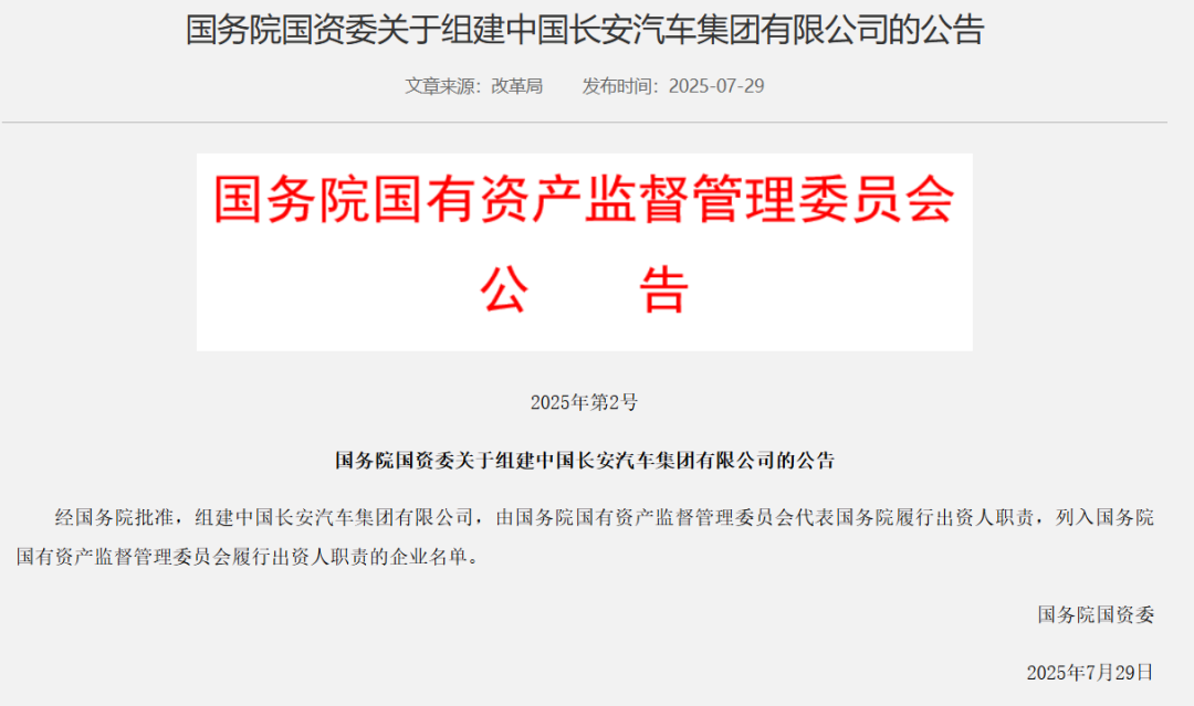 同时,国务院国资委发布公告,经国务院批准,组建中国长安汽车集团有限公司,列入国务院国有资产监督管理委员会履行出资人职责的企业名单。
