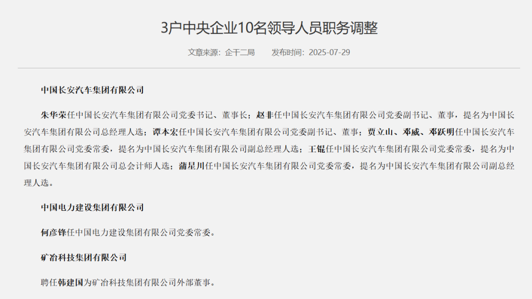7月29日,国务院国资委网站中央企业名录更新,中国长安汽车集团有限公司入列排序第73位,这也是由国务院国资委直接管理的第100家央企。同时,国务院国资委发布3户中央企业10名领导人员职务调整公告,朱华荣出任中国长安汽车集团有限公司党委书记、董事长。相关链接:中国长安汽车集团将于7月30日宣告成立