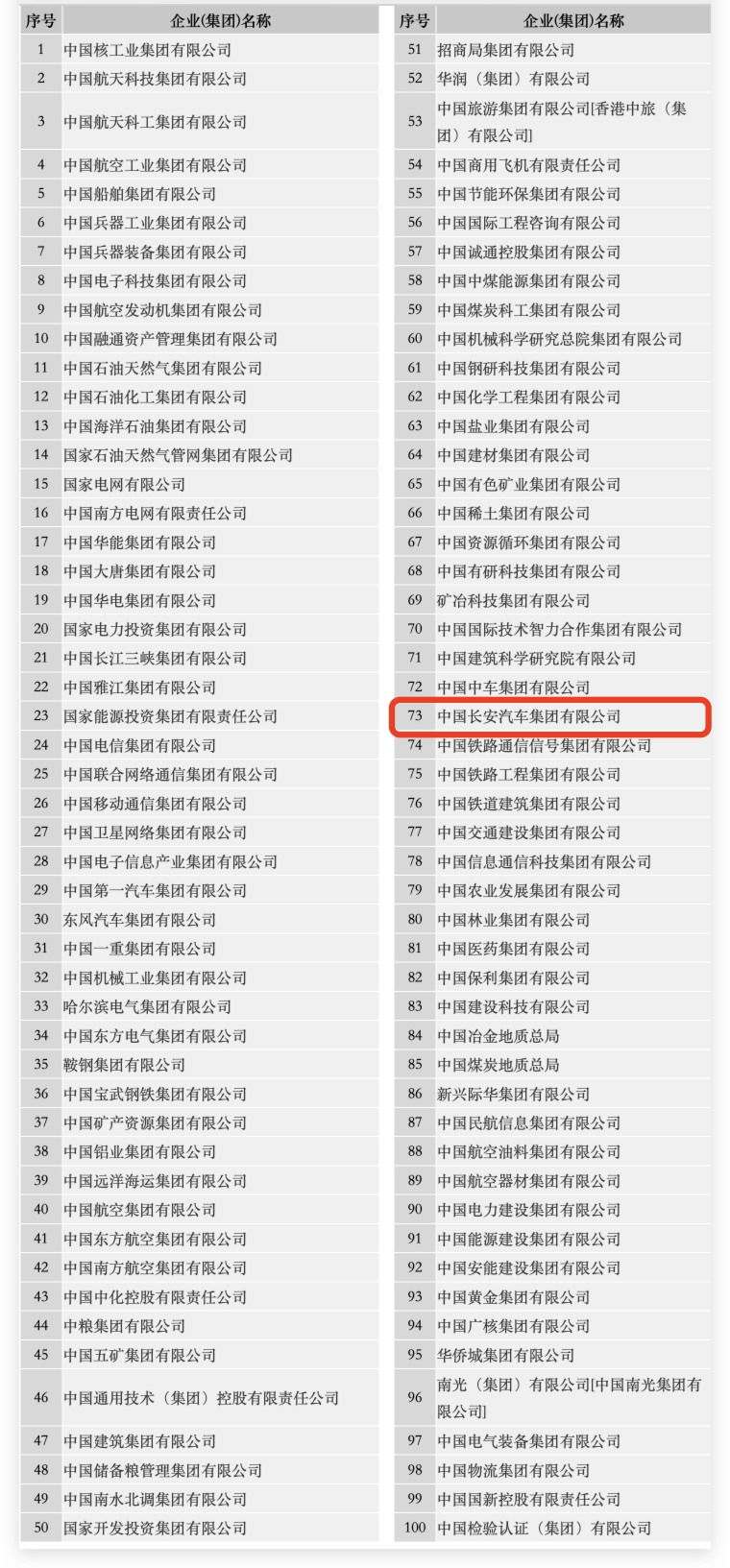 在国务院国资委发布的最新央企名录中,中国长安汽车集团的序号为73,这也是由国务院国资委直接管理的第100家央企。