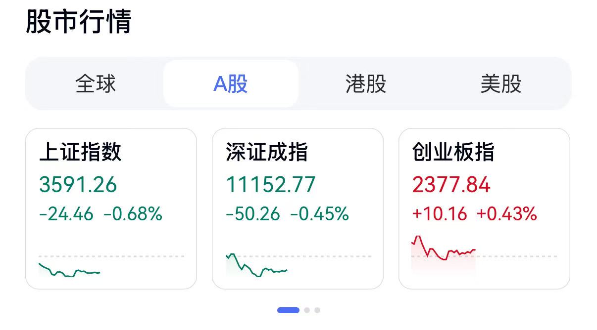 截至午间收盘,沪指报3591.26点,跌0.68%;深成指报11152.77点,跌0.45%;创指报2377.84点,涨0.43%。