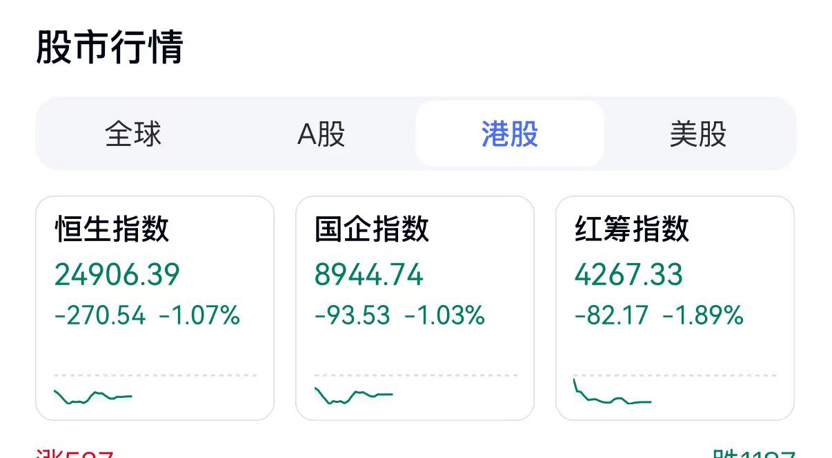 7月31日消息,港股三大指数涨跌不一。截至午间收盘,恒生指数跌1.07%,报24906.39点,恒生科技指数涨0.34%,国企指数跌1.03%。
