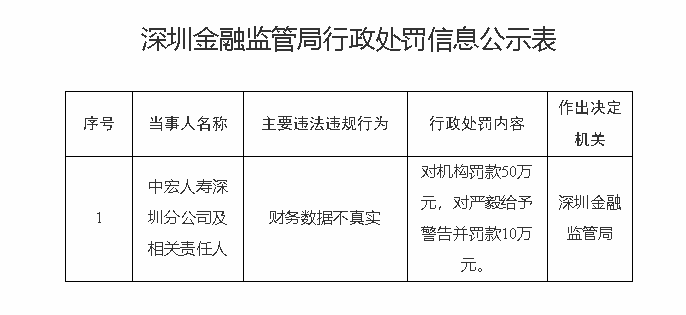 8月1日,据深圳金融监管局行政处罚信息公示表显示,中宏人寿深圳分公司因财务数据不真实,被罚款50万元。同时,相关责任人严毅被给予警告并罚款10万元。