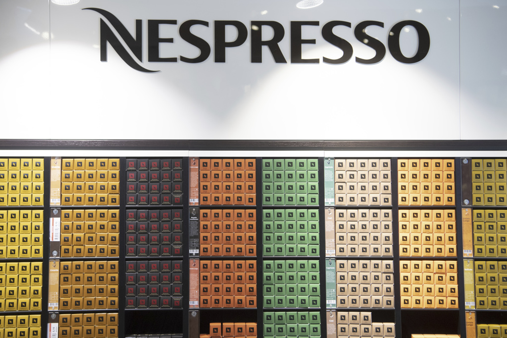 ▲瑞士日内瓦湖畔的维薇镇(Vevey)的雀巢自有品牌超市陈列Nesspresso胶囊咖啡产品。(美联社)