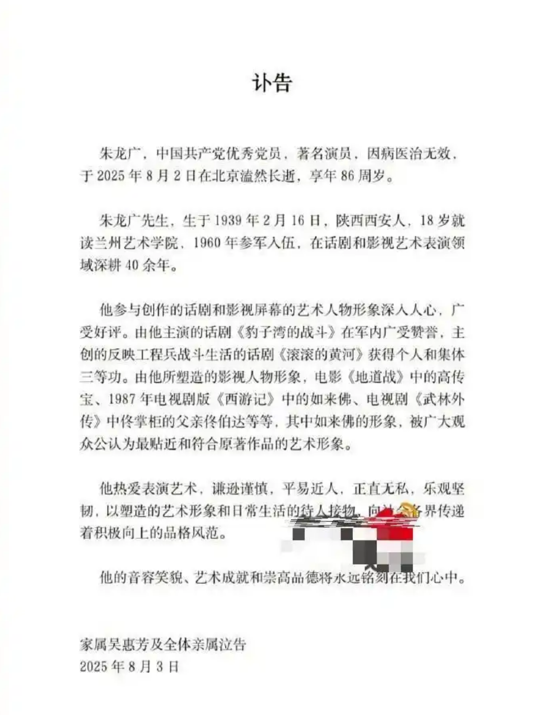 8月3日,演员朱龙广家属发布讣告,演员朱龙广因病医治无效,于2025年8月2日在北京逝世,享年86岁。据悉,朱龙广曾塑造《地道战》高传宝、87版《西游记》如来佛、《武林外传》佟掌柜父亲佟伯达等经典角色。