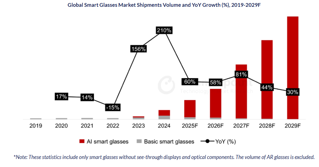 Counterpoint表示,随着 Ray-Ban Meta 智能眼镜的成功发布,一波史无前例的AI智能眼镜涌现出来,从供应链公司提供的参考设计产品到眼镜品牌厂商推出的商业化产品,均已在2024年底之后问世。该机构预计,随着2025年智能手机领军企业们陆续推出首款AI智能眼镜,且更多智能消费电子设备公司可能将在2025年和2026年陆续进入市场,Counterpoint预计2025年全球智能眼镜市场将实现60%的同比增长,并在2025年至2029年期间维持超过60%的年均复合增长率。