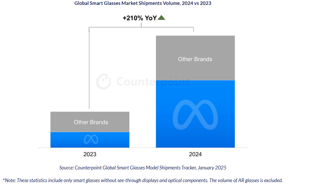 根据市场研究机构Counterpoint Research 的《全球智能眼镜型号出货量追踪报告》,2024年全球智能眼镜出货量同比增长 210% ,主要受到 Ray-Ban Meta 智能眼镜强劲需求的推动。因此,Counterpoint Research所统计的全球智能眼镜市场首次突破 200 万台大关,创下了前所未有的增长速度。