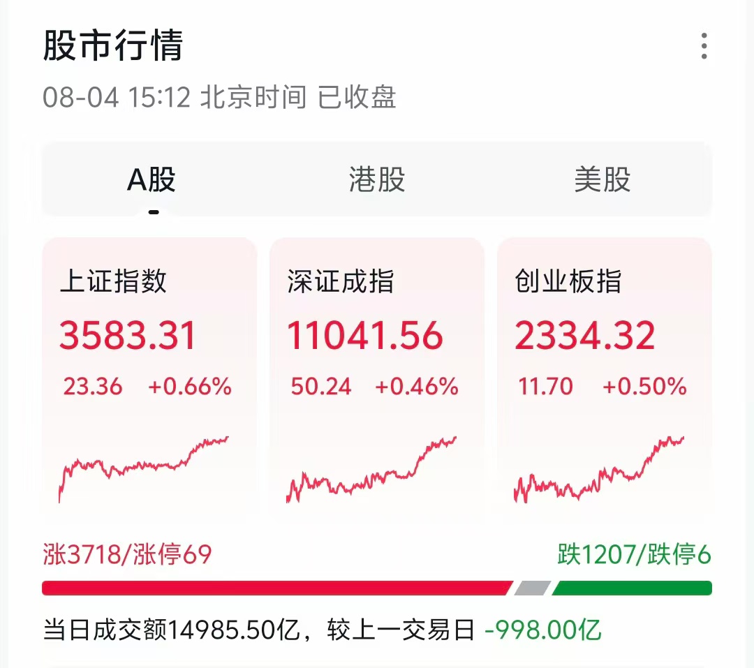 8月4日消息,创指、深成指午后转涨,三大股指悉数收红。截至收盘,沪指报3583.31点,涨0.66%;深成指报11041.56点,涨0.46%;创指报2334.32点,涨0.50%。