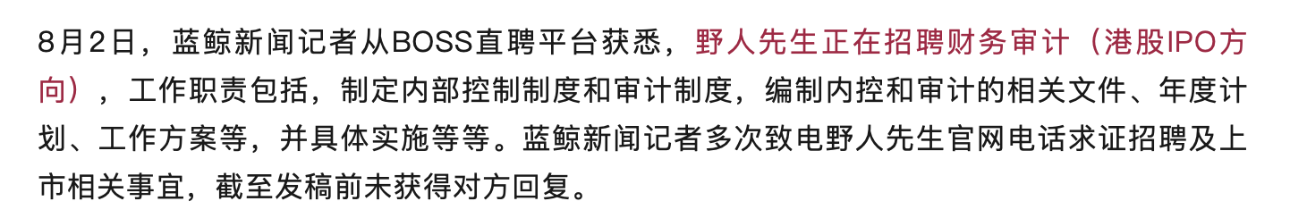 而从招聘方向来看,野人先生或计划进行港股IPO,这一路径也与近两年中国新消费企业的上市路径吻合。