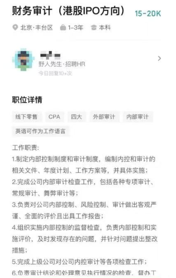 近日,据媒体报道,野人先生正在招聘财务审计(港股IPO方向),工作职责包括:制定内部控制制度和审计制度,编制内控和审计的相关文件、年度计划、工作方案等,并具体实施等。