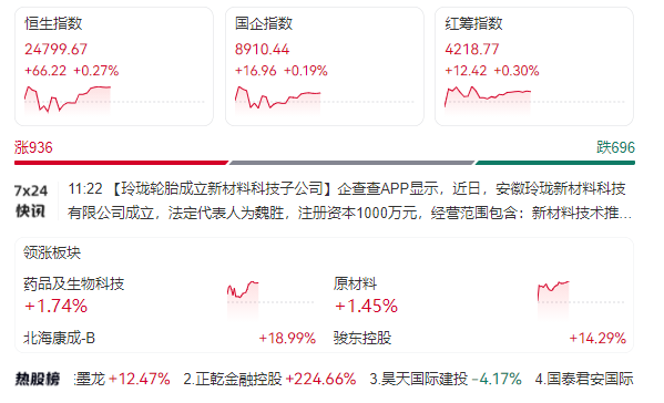 截至午间收盘,恒生指数(24799.049, 65.60, 0.27%)涨0.27%,报24799.67点,恒生科技指数(5499.25, 18.00, 0.33%)涨0.33%,国企指数涨0.19%。