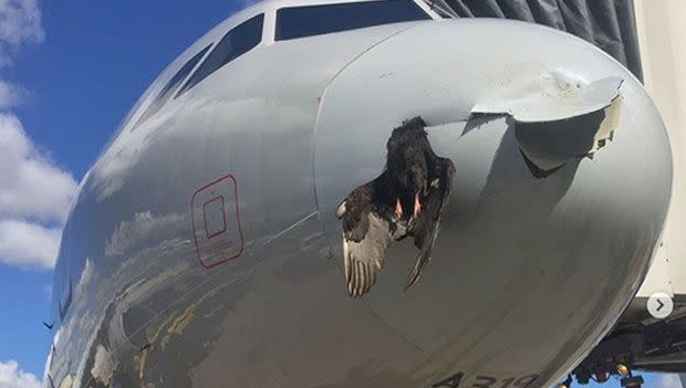 从现场照片中可看到,大鸟导致飞机头严重毁损,一大部分零件脱落,由于大鸟后来被吸入左引擎中,导致几片风扇叶片受损。