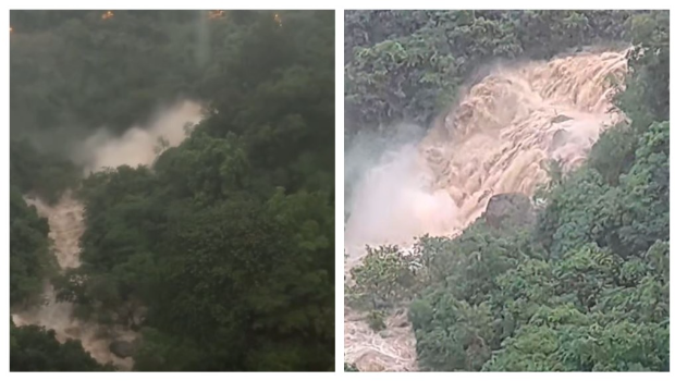 有网民拍得片段,所见今早黑雨期间,荃湾曹公潭一带爆发山洪,场面惊人。山上涌现激流如瀑布般涌向山脚,湍急水流沿途冲毁多棵树木,位于下游的明渠水位上涨,火车轨旁边惊现“黄河”。据了解近中午雨势减弱,水位才稍为退减。