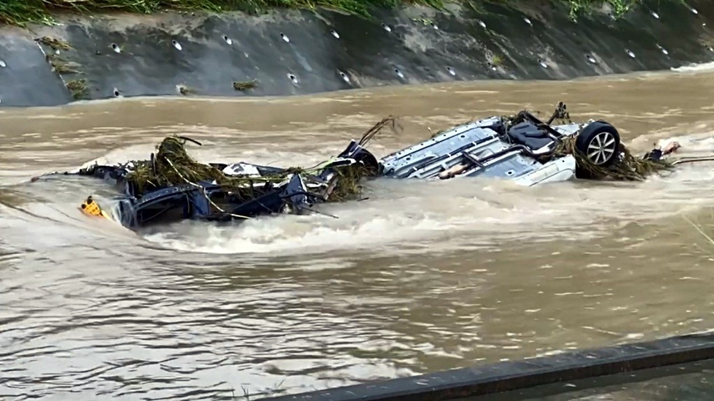 影片显示,锦田河水流湍急,河水呈泥黄色。有两辆私家车被困在河道中央,其中一辆车身四轮朝天,车顶朝下,大部分车身被河水淹没,车身和车轮上缠绕着大量杂草;另一辆私家车部分露出水面,亦被杂物覆盖。