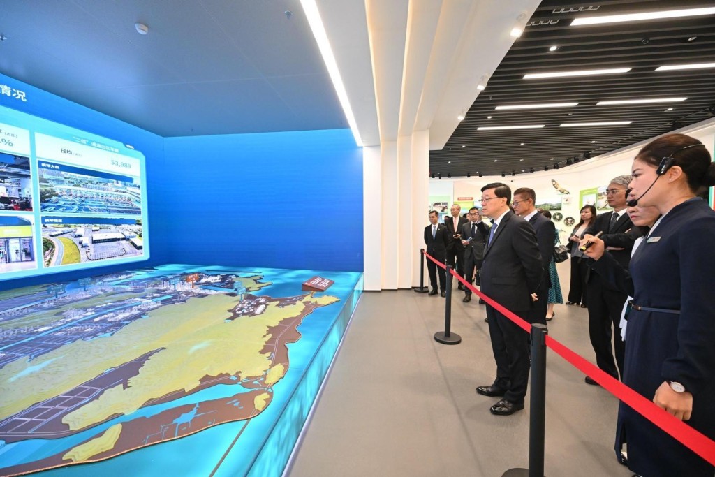 ▲李家超(前排右二)参观横琴粤澳深度合作区规划展览馆。政府新闻处图片