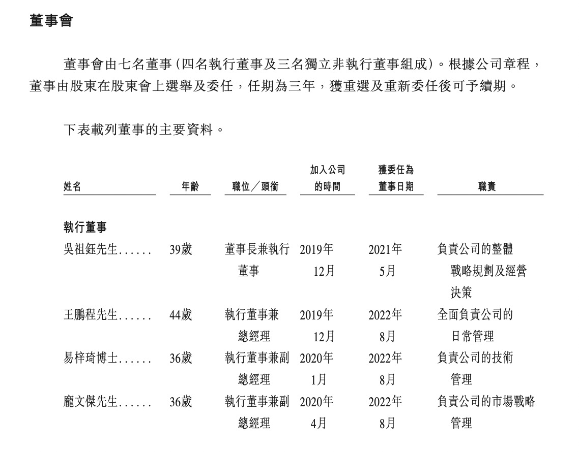 资料显示,吴祖钰,现年39岁,为公司的创始人、董事长兼执行董事。吴祖钰于2019年12 月创立公司,于2021年5月及2022年8月分别获委任为公司的董事及董事长,并于2025年3月获调任为执行董事。他主要负责公司的整体战略规划及经营决策。