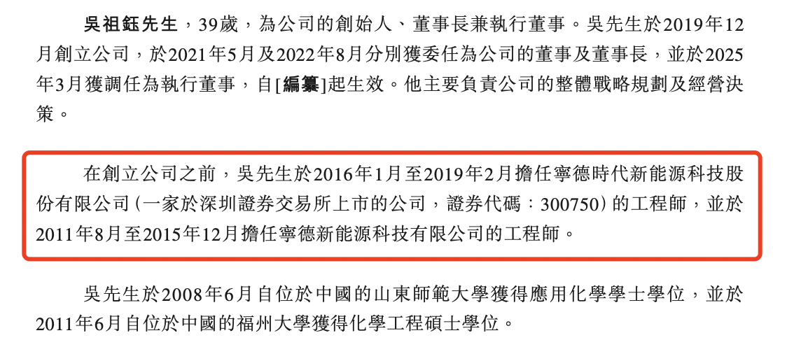 在创立公司之前,吴祖钰于2016年1月至2019年2月担任宁德时代新能源科技股份有限公司的工程师,并于2011年8月至2015年12月担任宁德新能源科技有限公司的工程师。