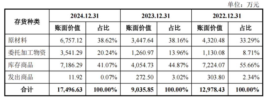 招股书显示,公司存货主要包括原材料、委托加工物资、库存商品和发出商品,2024年分别占比38.62%、20.24%、41.07%及0.07%。