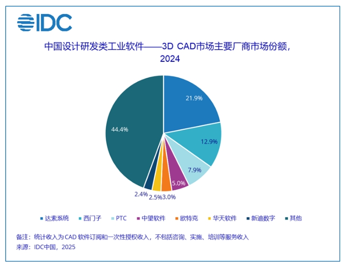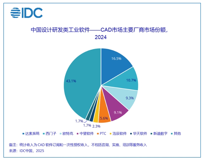 IDC调研数据显示,未来三年,39%的中国制造企业IT预算仍将主要投入在设计研发类工业软件中。IDC分析表明,2024年中国计算机辅助设计(CAD)软件总市场份额61.2亿元人民币,年增长率为11.8%,较去年增速下降了 1个百分点,主要挑战在于我国重点工业企业数字化研发设计工具普及率已达82%的高点,市场增长因素来自头部工业企业的增购、升级和替换需求,长尾的中小工业企业需求,以及原有盗版客户的合规采购需求,市场已逐步趋于稳态。