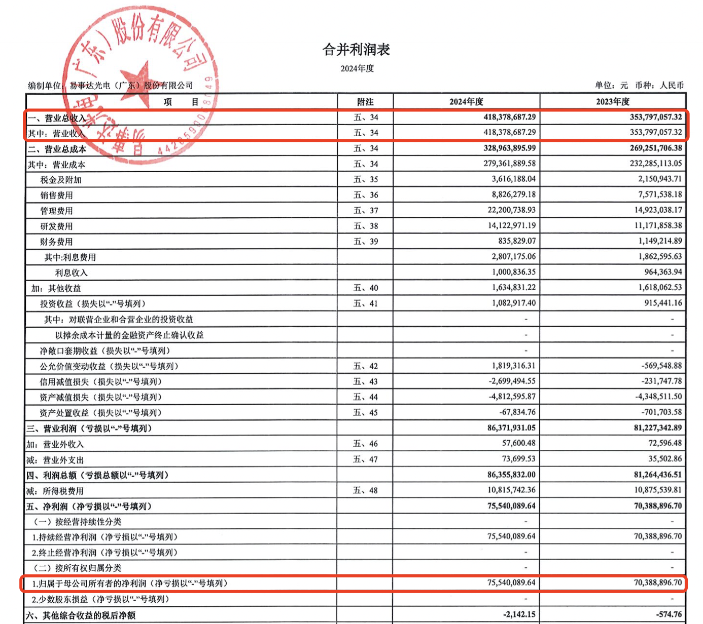2024年,易事达实现营收为4.18亿元,同比增长18.25%;归母净利润为7554.01万元,同比增长7.32%。