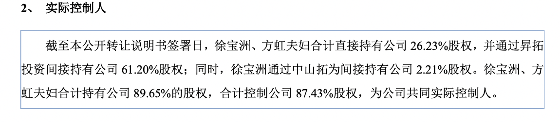 而徐宝洲、方虹夫妇合计直接持有公司26.23%股权,并通过昇拓投资间接持有公司61.20%股权;同时,徐宝洲通过中山拓为间接持有公司2.21%股权。徐宝洲、方虹夫妇合计持有公司89.65%的股权,合计控制公司87.43%股权,为公司共同实际控制人。