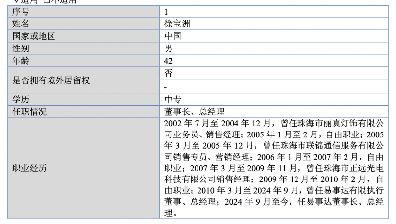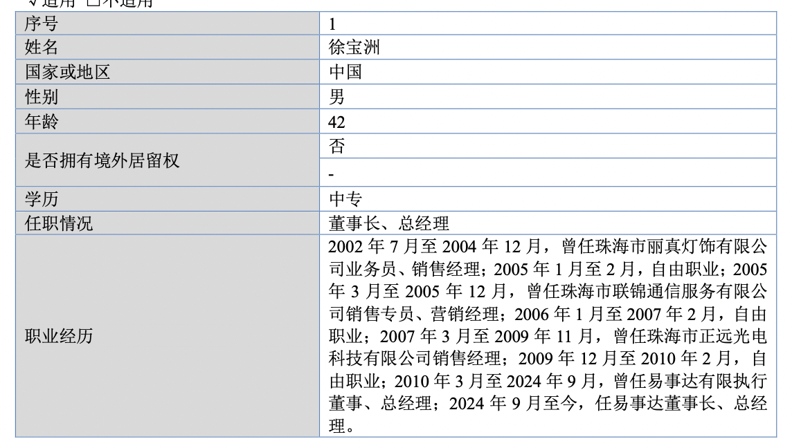 资料显示,徐宝洲,42岁,中专学历,其于2002年7月至2004年12月,曾任珠海市丽真灯饰有限公司业务员、销售经理;2005年1月至2月,自由职业;2005年3月至2005年12月,曾任珠海市联锦通信服务有限公司销售专员、营销经理;2006年1至2007年2月,自由职业;2007年3月至2009年11月,曾任珠海市正远光电科技有限公司销售经理;2009年12月至2010年2月,自由职业;2010年3月至2024年9月,曾任易事达有限执行 董事、总经理;2024年9月至今,任易事达董事长、总经理。