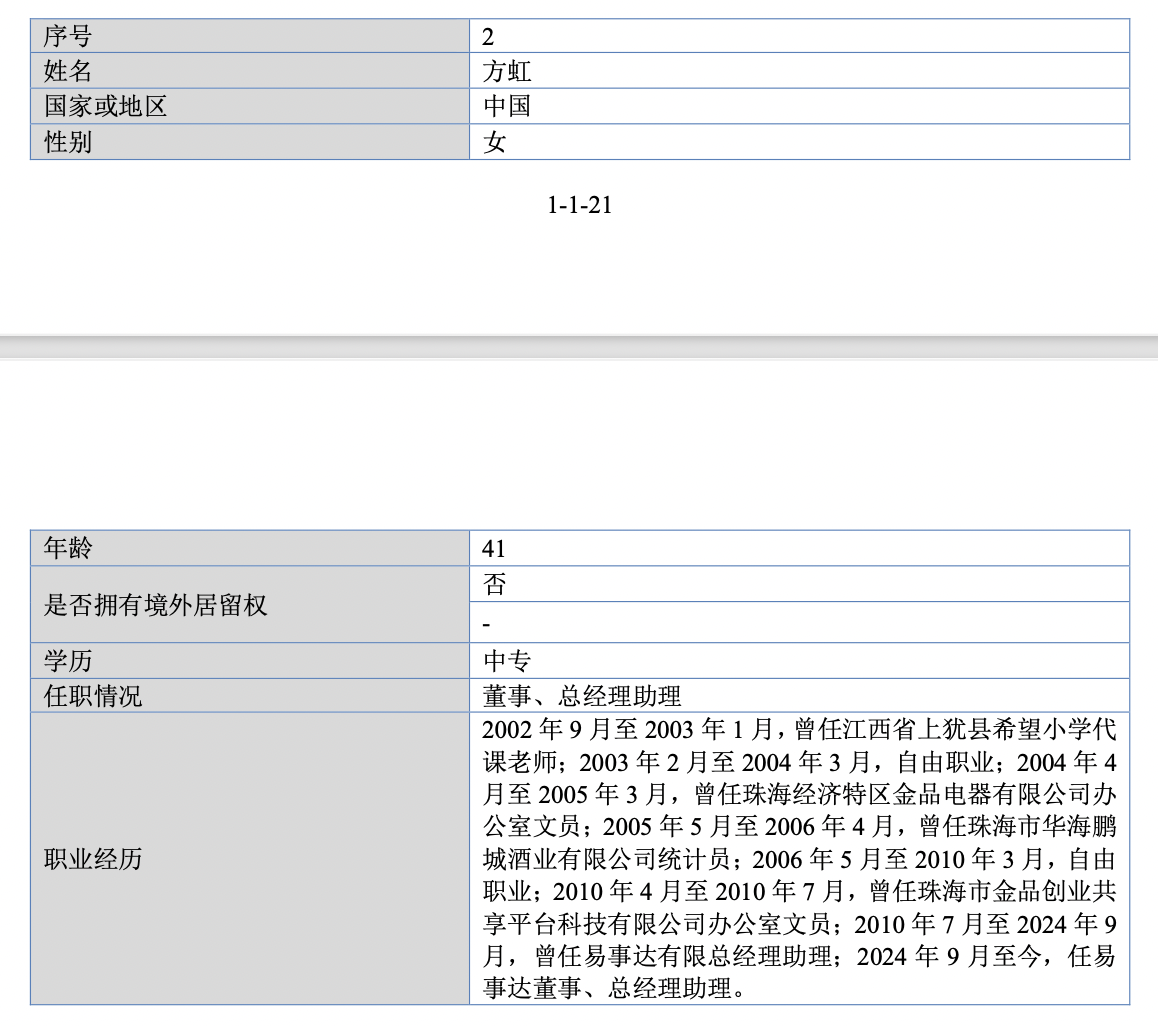 方虹,41岁,中专学历,其于2002年9月至2003年1月,曾任江西省上犹县希望小学代课老师;2003年2月至2004年3月,自由职业;2004年4月至2005年3月,曾任珠海经济特区金品电器有限公司办公室文员;2005年5月至2006年4月,曾任珠海市华海鹏城酒业有限公司统计员;2006年5月至2010年3月,自由职业;2010年4月至2010年7月,曾任珠海市金品创业共享平台科技有限公司办公室文员;2010年7月至2024年9月,曾任易事达有限总经理助理;2024年9月至今,任易事达董事、总经理助理。
