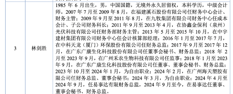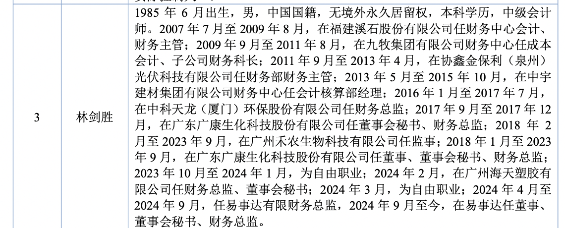 林剑胜,1985年6月出生,男,中国国籍,无境外永久居留权,本科学历,中级会计师。其于2007年7月至2009年8月,在福建溪石股份有限公司任财务中心会计、财务主管;2009年9月至2011年8月,在九牧集团有限公司财务中心任成本会计、子公司财务科长;2011年9月至2013年4月,在协鑫金保利(泉州) 光伏科技有限公司任财务部财务主管;2013年5月至2015年10月,在中宇建材集团有限公司财务中心任会计核算部经理;2016年1月至2017年7月,在中科天龙(厦门)环保股份有限公司任财务总监;2017年9月至2017年12月,在广东广康生化科技股份有限公司任董事会秘书、财务总监;2018年2月至2023年9月,在广州禾农生物科技有限公司任监事;2018年1月至2023年9月,在广东广康生化科技股份有限公司任董事、董事会秘书、财务总监;2023年10月至2024年1月,为自由职业;2024年2月,在广州海天塑胶有限公司任财务总监、董事会秘书;2024年3月,为自由职业;2024年4月至2024年9月,任易事达有限财务总监,2024年9月至今,在易事达任董事、董事会秘书、财务总监。