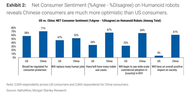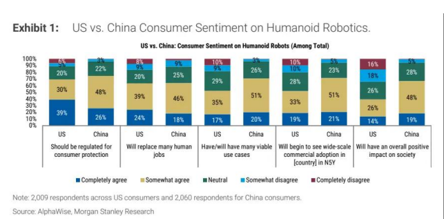 摩根士丹利AlphaWise团队在美国和中国开展了一项消费者脉搏调查,以收集人们对人形机器人的看法。该调查从每个地区收集了约 2000 份回复(总计4000份),大摩认为这能代表性地反映当前社会对具象化人工智能和机器人未来的看法。