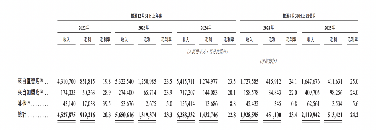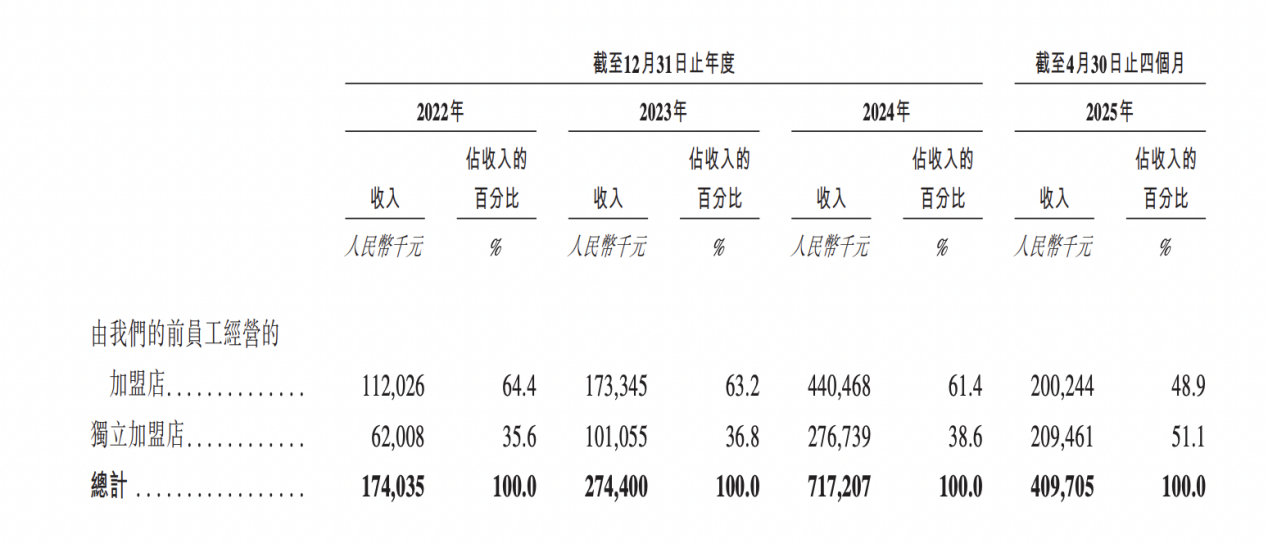 值得注意的是,2022年、2023年、2024年和2025年前4个月,老乡鸡分别有59名、101名、241名及272名加盟商是公司的前员工,其于各自时间共同经营73家、157家、318家及364家加盟店。同期,由前员工经营的加盟店产生的收入分别占加盟店总收入的64.4%、63.2%、61.4%及48.9%。