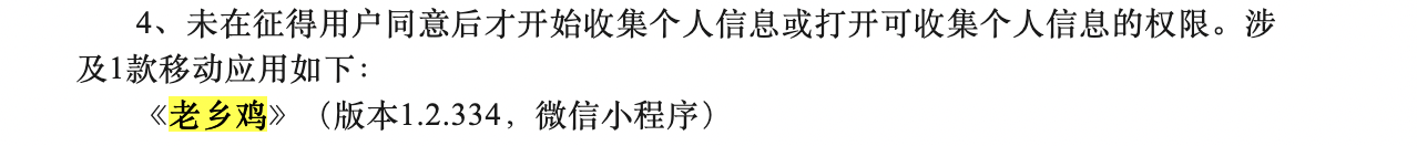 值得注意的是,7月11日,国家网络与信息安全信息通报中心通报了68款App违法违规收集使用个人信息。其中,《老乡鸡》(微信小程序)存在“未在征得用户同意后才开始收集个人信息或打开可收集个人信息的权限”等4类违规情形。