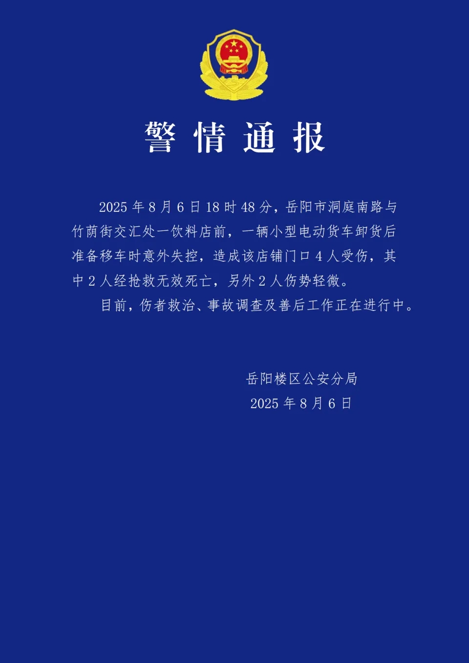 针对事件,岳阳楼区公安分局8月6日晚发布警情通报称,6日傍晚6时48分,岳阳市洞庭南路与竹荫街交汇处一饮料店前,一辆小型电动货车卸货后准备移车时意外失控,造成该店铺门口4人受伤,其中2人经抢救无效死亡,另外2人伤势轻微。目前,伤者救治、事故调查及善后工作正在进行中。