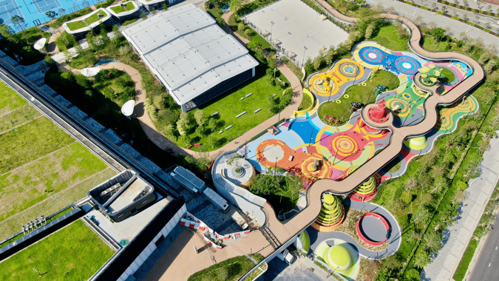 乐园高低起伏的“小山丘”在户外空间伸延,色调各有象征:黄色代表金,绿色是木,蓝色象征水,红色则代表火,而橙色是土。这些设施透过不同材质展现五行的基本形态,并结合无障碍设计元素,刺激小朋友的感官发展,启发他们对宇宙的洞察。