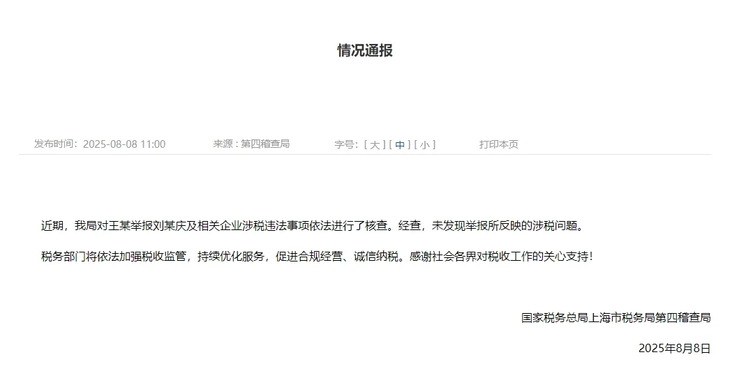 演员刘晓庆日前被深圳市民王先生实名举报涉嫌偷税漏税问题引发广泛关注。8月8日,国家税务总局上海市税务局发布情况通报:近期,该局对王某举报刘某庆及相关企业涉税违法事项依法进行了核查。经查,未发现举报所反映的涉税问题。税务部门将依法加强税收监管,持续优化服务,促进合规经营、诚信纳税。